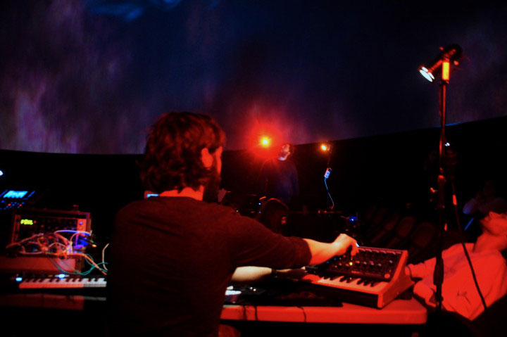 Le stage de création au Planétarium ne se déroulant que sur une poignée de jours, j’ai dû me résoudre, comme la plupart des participants, à recycler certaines de mes compositions personnelles afin d’investir davantage mon temps de travail sur la structure et la réflexion quant à la spatialisation des sources sonores dans le dôme, plutôt qu’à la création de nouveaux contenus. Le début de la performance est joué en direct au synthétiseur modulaire, tandis que la suite (dès 2:28) est un arrangement écrit sur Ableton Live. Pierre Amoudruz, quant à lui, utilise un contrôleur MIDI connecté à Resolume afin d’interagir avec le son.